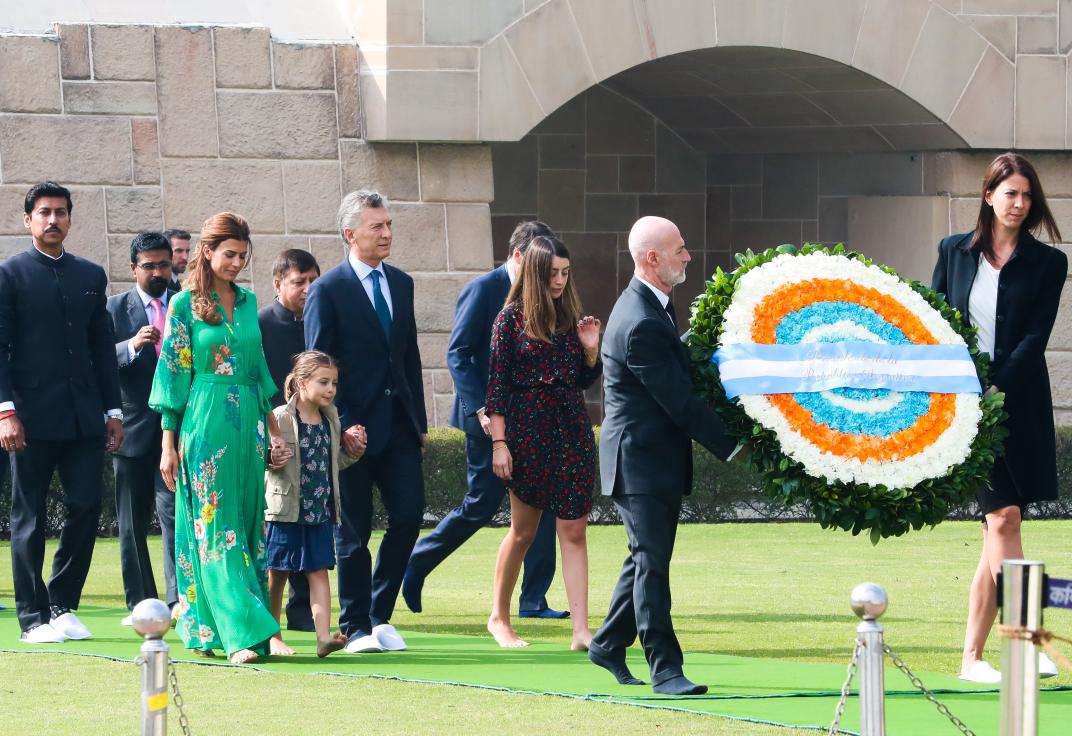 El Presidente argentino llegó a media mañana junto a la Primera Dama, Juliana Awada, y su comitiva al Memorial Mahatma Gandhi, ubicado a unos cinco kilómetros de su lugar de alojamiento.