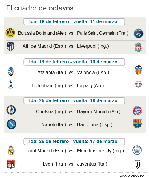 La Champions League ingresa en su etapa más apasionante, esa en el que los equipos se miden en enfrentamientos ida y vuelta que en búsqueda del boleto para las siguientes etapas. La UEFA realizó ayer el sorteo que determinó la conformación de los octavos final, que se disputarán en 2020. La gran final será el 30 de mayo en Estambul.