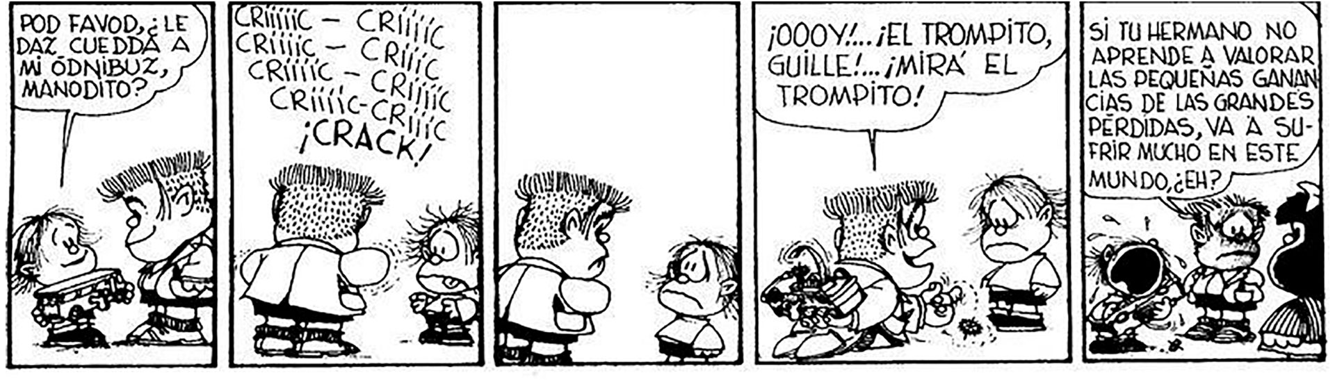 En aquel diario El Mundo, Mafalda ganaba lectores con su mirada franca y descarada: Quino empezó a escribir verdaderos editoriales políticos en los cuadritos de la historieta, que empezó a publicarse en los diarios del interior. Al día siguiente del golpe militar que el 28 de junio de 1966 tumbó al gobierno de Illia, una demudada Mafalda, sólo boca, ojos y pómulos que desbordaban el alto del único cuadro del día, se preguntaba: “Entonces, ¿eso que me enseñaron en la escuela?”. Nunca tuvo respuesta.