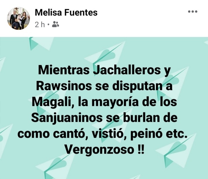 "Revisando el árbol genealógico, según quienes conocen a la familia, el papá llamado David es de Jáchal (gendarme retirado) y la mamá (Edith) también, más especificamente de la localidad de La Represa y que acá vivían en calle San Juan antes de Sarmiento. Según dicen, se fueron a vivir a San Juan hace varios años y sus hijas, entre las que se encuentra Magalí, eran muy pequeñas, por lo que algunos consideran comprensible que no tengan presente a nuestro departamento y que era lógico que sea Rawson el lugar con el cual se identifique, ya que se crió en esa populosa zona del Gran San Juan", amplió.