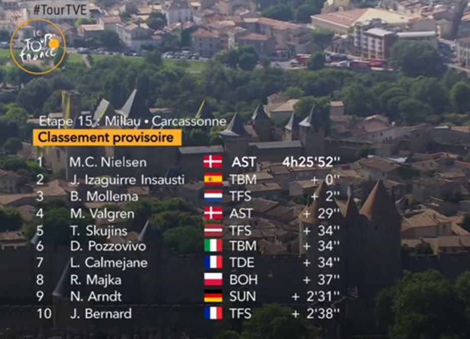 En el tramo final, Nielsen, Mollema y el propio Izagirre se marcharon a por el triunfo. El danés, muy favorito al sprint, cumplió los pronósticos y ganó por delante de Izagirre,que repitió el segundo puesto que ya cosechara en la décima etapa. El pelotón llegó a 13 minutos, sin cambios en la clasificación general.