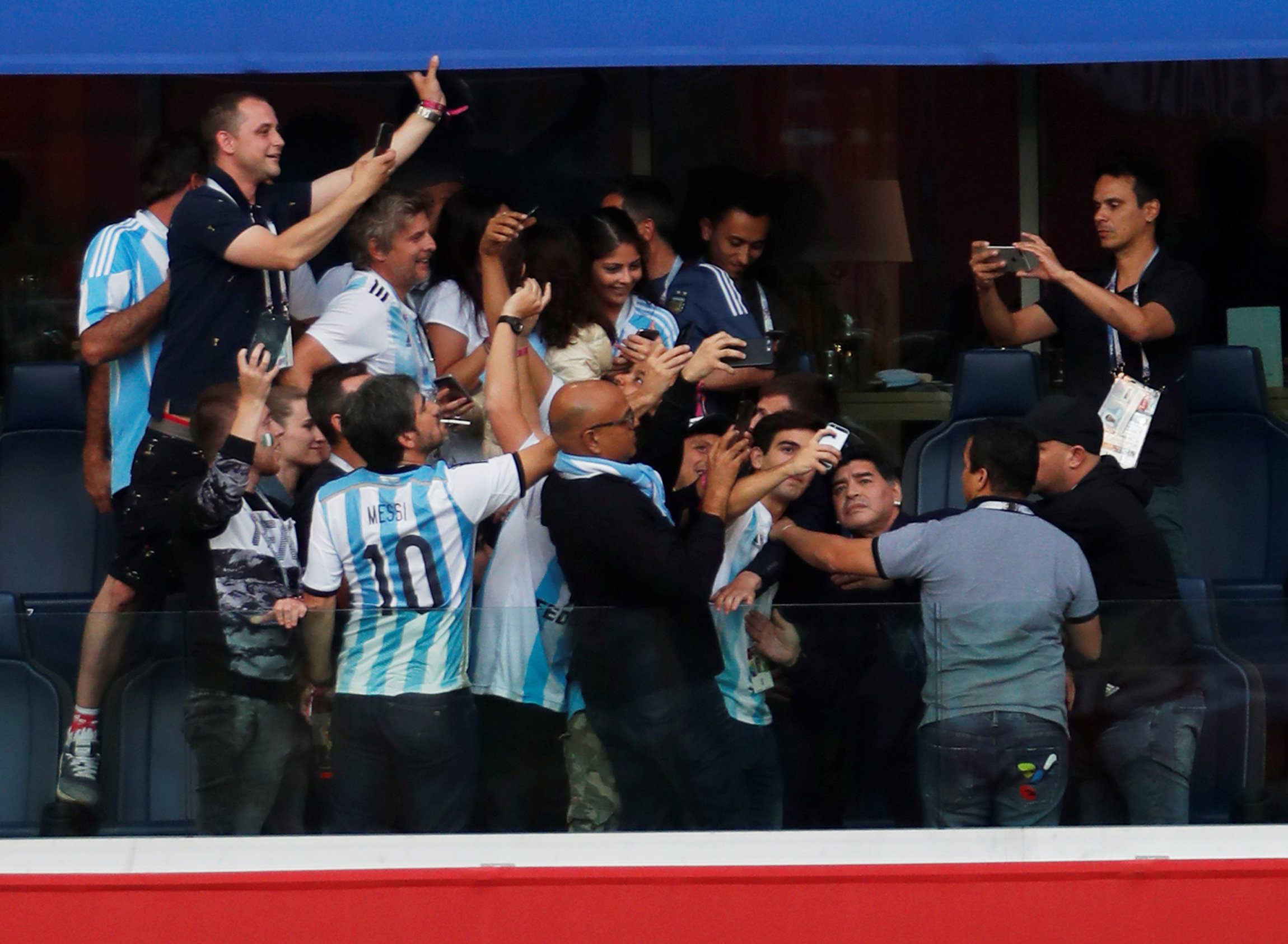 Diego Armando Maradona fue protagonista en Nigeria-Argentina, en el que la Albiceleste logró el pase a los octavos de final del Mundial de Rusia 2018, por su actitud en uno de los palcos del estadio de San Petersburgo. El genial exfutbolista argentino, campeón del mundo en México 1986, se hizo notar desde su entrada al palco en los prolegómenos del encuentro, con un baile con una aficionada africana al ritmo de la música que se reproducía en la megafonía del estadio que fue transmitido en las pantallas gigantes y jaleado por la mayoritaria de la hinchada argentina. Con el 1-0 anotado por Messi, Maradona extendió los dos brazos al cielo mientras celebraba el tanto que adelantaba a la Selección argentina, pero cuando llegó el 1-1 de Nigeria, anotado de penal por Victor Moses, el astro argentino hizo signos evidentes de desesperación por el resultado que sacaba del Mundial a su Selección. El 2-1 anotado por Marcos Rojo en el minuto 86 del partido fue el de la explosión de Maradona. Contenido por algunos de sus compañeros en el palco, se acercó hasta el borde del mismo e hizo el gesto de la ‘peineta’ con ambas manos. Tras el encuentro, se hicieron virales a través de las redes sociales varios videos en los que se veía al exfutbolista y exentrenador salir del palco en malas condiciones y con necesidad de ayuda por parte de sus custodios en el lugar. Extraoficialmente se supo después que fue atendido en un sanatorio y que se encontraba en recuperación.
