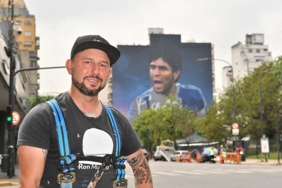 Martín Ron, considerado uno de los mejores muralistas del mundo, es el encargado de la obra que tiene como protagonista al hombre más representativo de la historia de la Selección argentina que se ubica frente a la Lola Mora, San Juan y Virrey Cevallos.