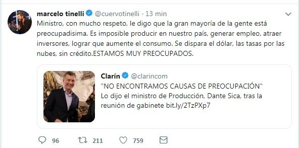 Marcelo Tinelli criticó al Gobierno con un mensaje que escribió en Twitter luego de las declaraciones de Dante Sica, ministro de Producción, que se mostró optimista tras la reunión de Gabinete.