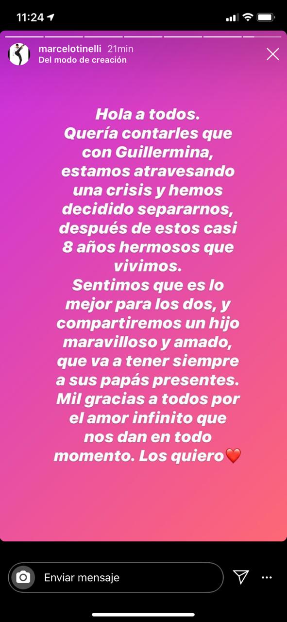 Este domingo, Marcelo Tinelli anunció su separación de la modelo y empresaria Guillermina Valdés. “Hola a todos quería contarles que con Guillermina, estamos atravesando una crisis y hemos decidido separarnos, después de estos casi 8 años maravillosos que vivimos. Sentimos que es lo mejor para los dos, y compartiremos un hijo maravillosos y amado, que va a tener siempre a sus papás presentes. Mil gracias a todos por el amor infinito que nos dan en todo momento. Los quiero”, escribió el conductor de ShowMatch.