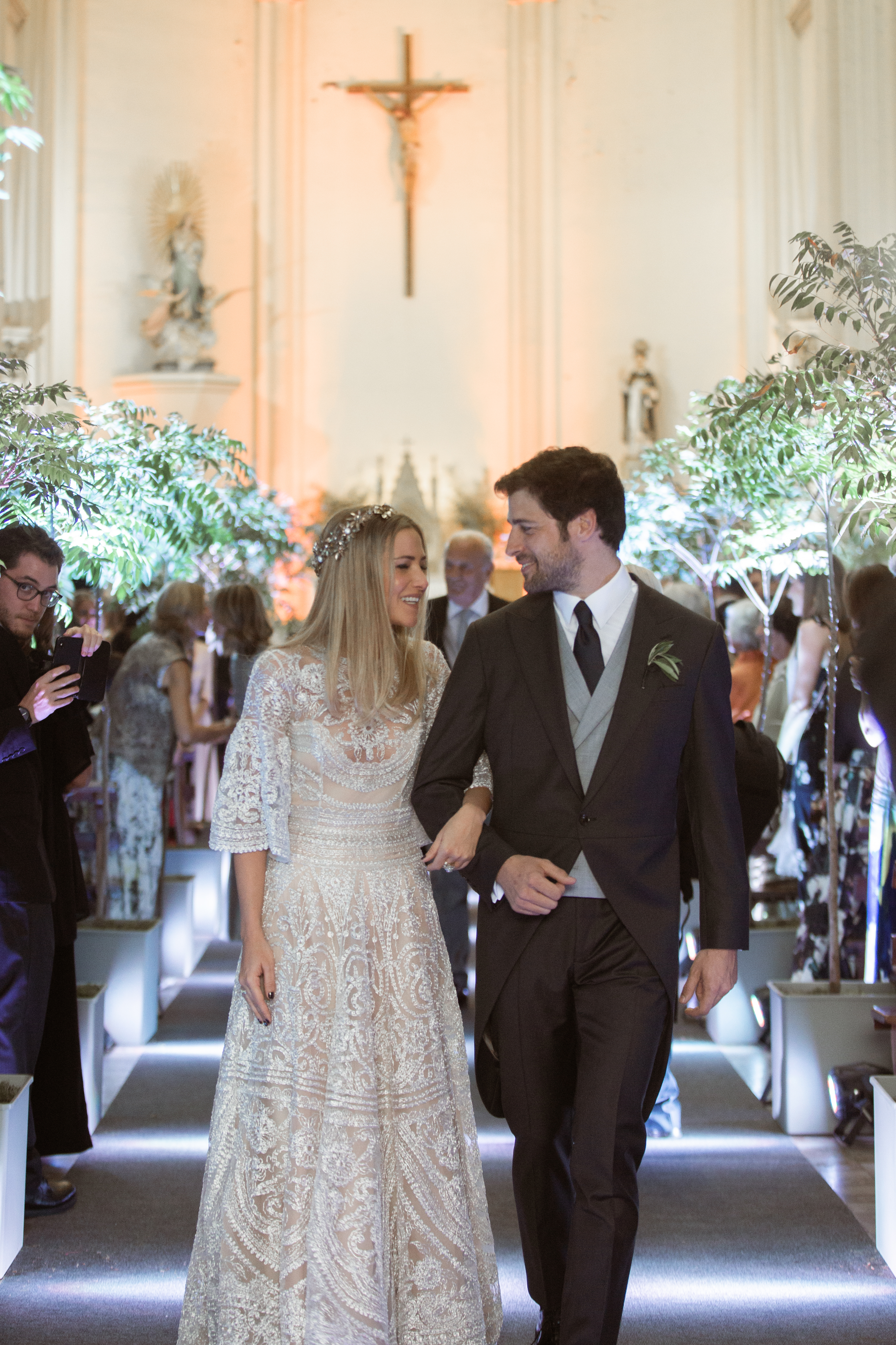 Milagros lució un vestido de Naeem Khan, diseñador americano-hindú, bordado a mano en India en hilos de plata. Hizo su entrada a la iglesia del brazo de Adriano Senetiner.