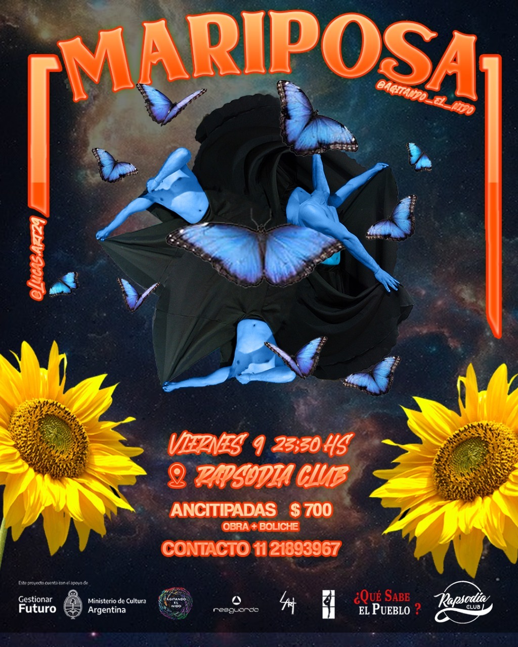 El estreno de Mariposa será el viernes 9 de diciembre, a las 23:30 horas, en Rapsodia Club (Lateral de Circunvalación y Salta). Las entradas anticipadas pueden reservarse al WhatsApp 1121893967 y en boletería de Rapsodia el día de la función, con opción a luego disfrutar del boliche.