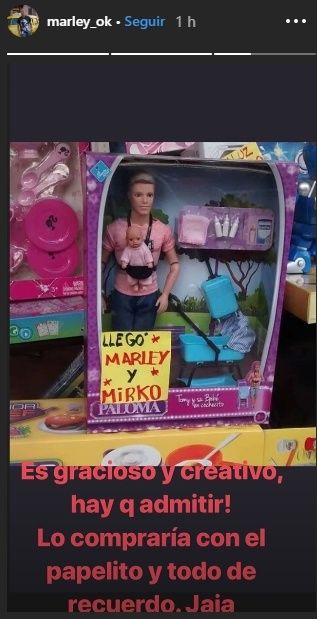 La foto muestra la caja con dos muñecos: el padre y su hijo bebé. Viene con accesorios como mamaderas, un cochecito y una mantita. El paquete dice "Tony y su bebé", pero le pegaron un papelito que los compara con la dupla preferida de las redes sociales: "Llegaron Marley y Mirko".