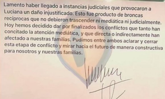 "Lamento haber llegado a instancias judiciales, que provocaron en Luciana un daño injustificado. Esto fue producto de broncas recíprocas que no debieron trascender ni mediática ni judicialmente.