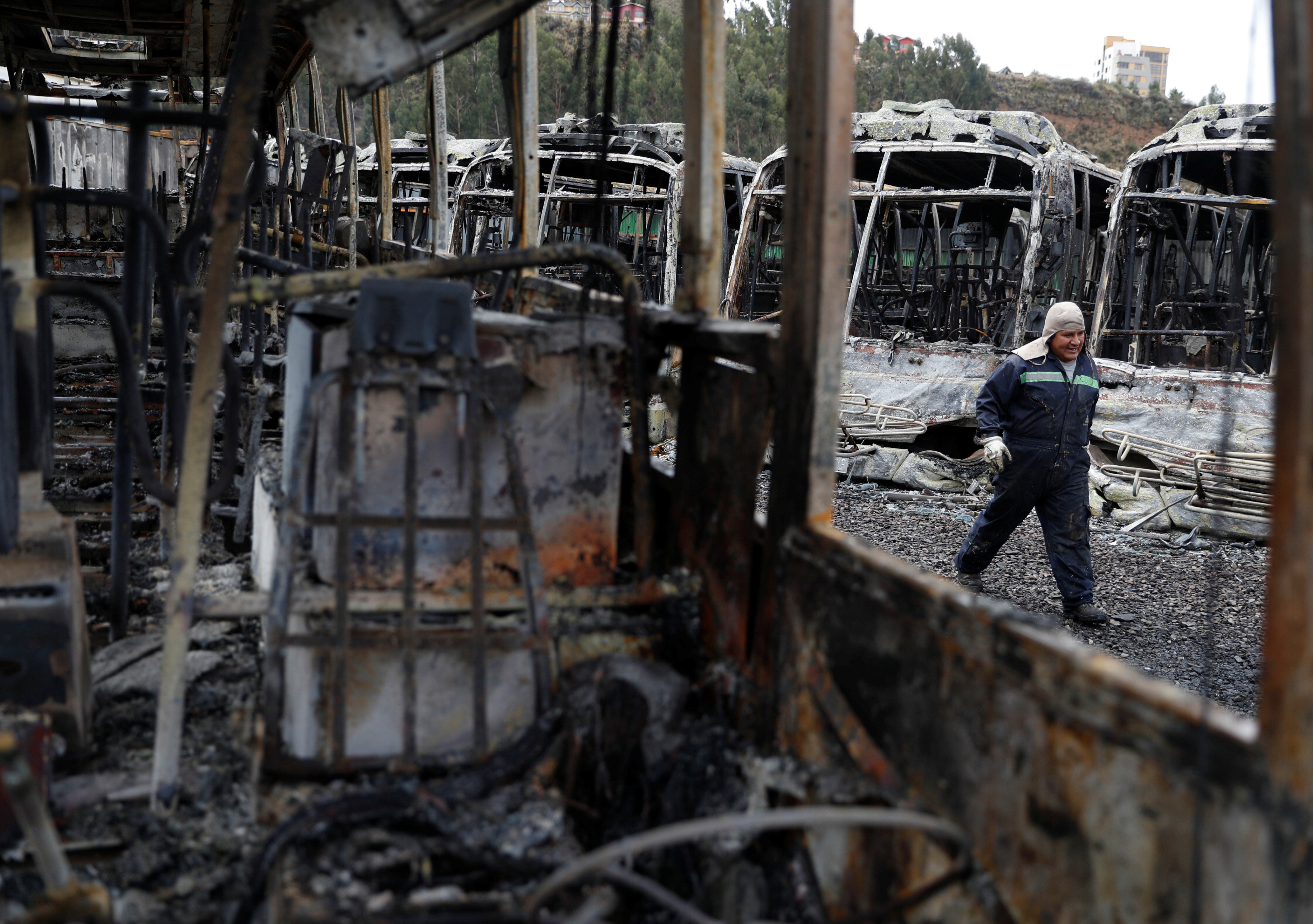 Al menos 64 autobuses del transporte municipal paceño resultaron dañados después de que turbas les prendieran fuego tras ingresar a los garajes de ese servicio en distintos puntos de la ciudad.