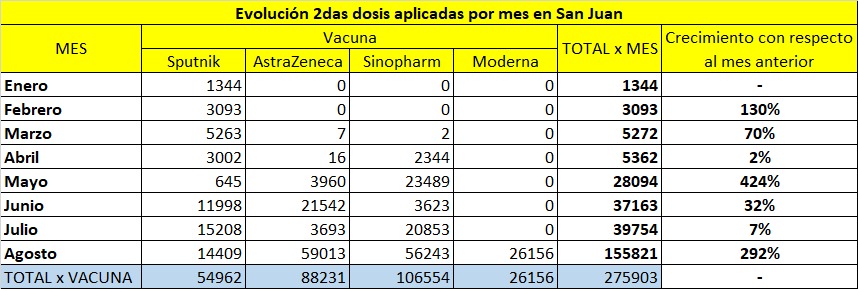 “Agosto será el mes de las segundas dosis”, adelantó la ministra de Salud de la Nación, Carla Vizzotti, el 27 de julio pasado. Y, gracias a la cantidad de vacunas recibidas la meta se cumplió a nivel nacional y las expectativas se superaron en San Juan. Es que, durante ese mes, en la provincia se colocó el 56,4 por ciento de las segundas dosis de coronavirus inoculadas desde que se inició la campaña.