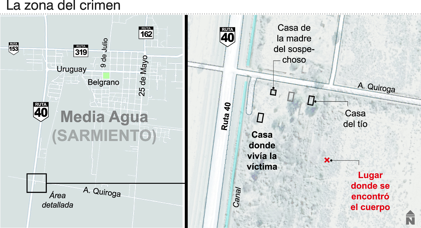 Con esos dos momentos los pesquisas terminaban poco antes de las 17 de ayer parte del trabajo en la escena donde fue asesinada una nena de 11 años llamada Yoselí Ailén Rodríguez Pereyra, la tercera de 6 hermanos que integran una humilde familia que vive en una especie de pequeño asentamiento apostado en el cuadrante sureste del cruce de Quiroga y Ruta 40, en las afueras de Media Agua, Sarmiento.