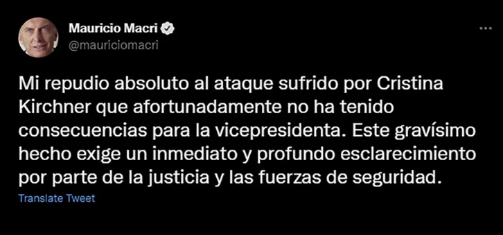 El ex presidente Mauricio Macri expresó solidaridad con la vicepresidenta Cristina Kirchner tras el atentado que sufrió esta noche cuando llegaba a su departamento del barrio de Recoleta. El líder del PRO exigió un “inmediato y profundo esclarecimiento por parte de la justicia y las fuerzas de seguridad”, luego del impactante episodio que se produjo minutos antes de las 22 en la esquina de Uruguay y Juncal, donde reside Cristina Kirchner.