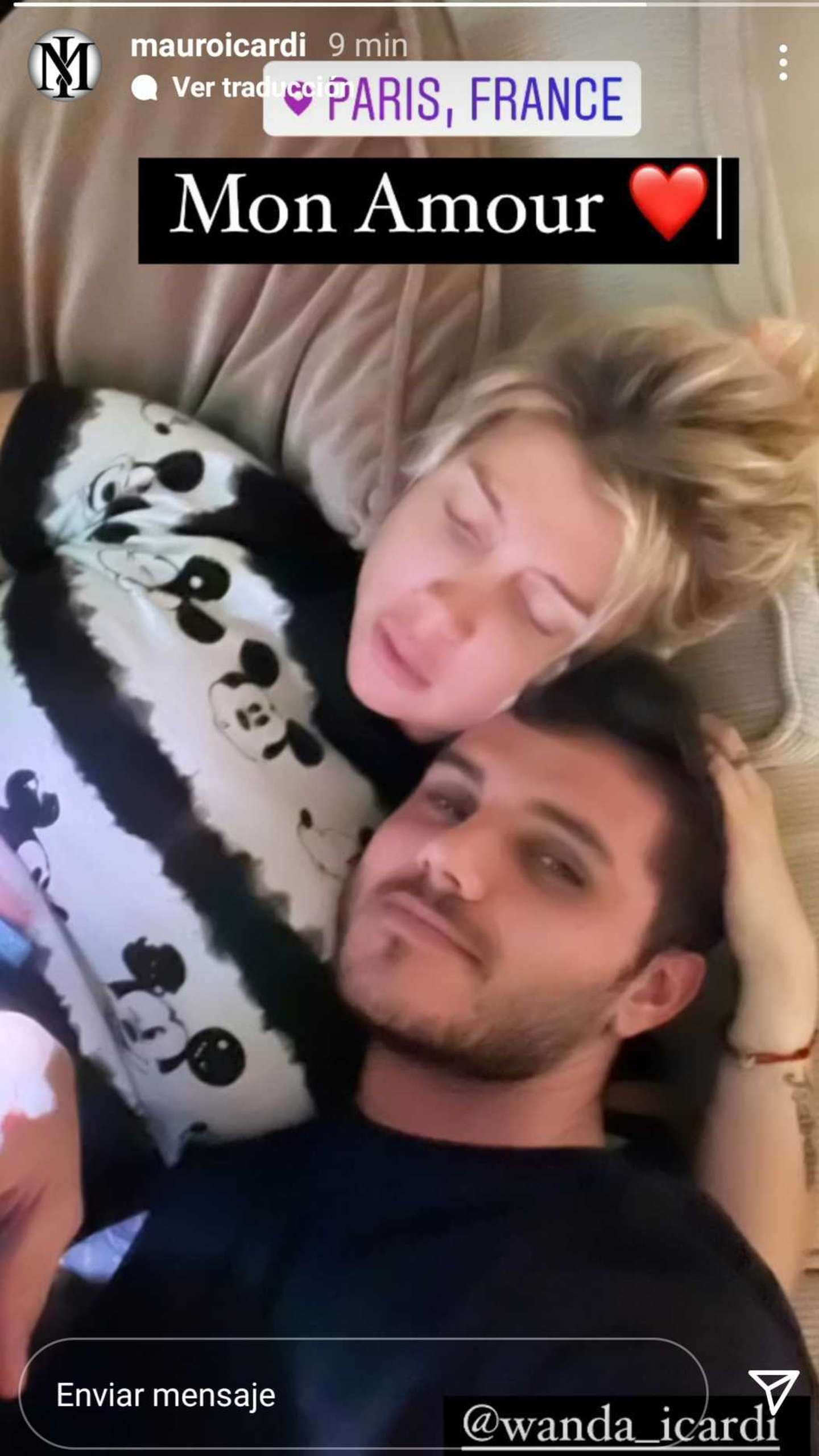 “Mon amour” (que significa “mi amor” en francés), escribió Icardi junto a la foto en la que ella está recostada. La empresaria mediática usa remera con el estampado de Mickey, tiene los ojos cerrados y su mano toca el pelo del deportista que, a su vez, mira a la cámara.