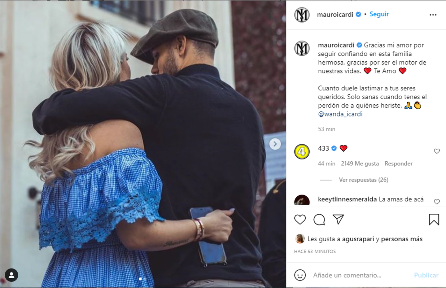 La nueva oportunidad que se dieron, según parece en la nueva imagen, vino precedida por un pedido de perdón del jugador del PSG. “Gracias, mi amor, por seguir confiando en esta familia hermosa, gracias por ser el motor de nuestras vidas. Te Amo. Cuánto duele lastimar a tus seres queridos. Solo sanás cuando tenés el perdón de quiénes heriste, @wanda_icardi”, escribió Icardi este martes en su cuenta de Instagram.