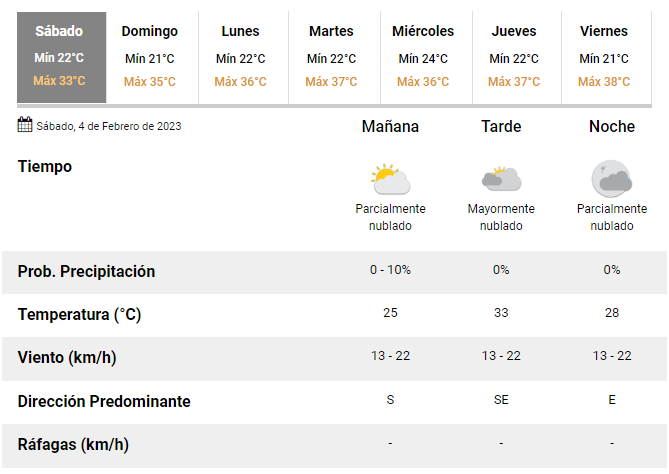 Para el domingo, se espera que la máxima ascienda hasta los 35ºC y la mínima sea de 21ºC. Para la nueva semana de febrero se aguardan máximas entre 36 y 38 grados.