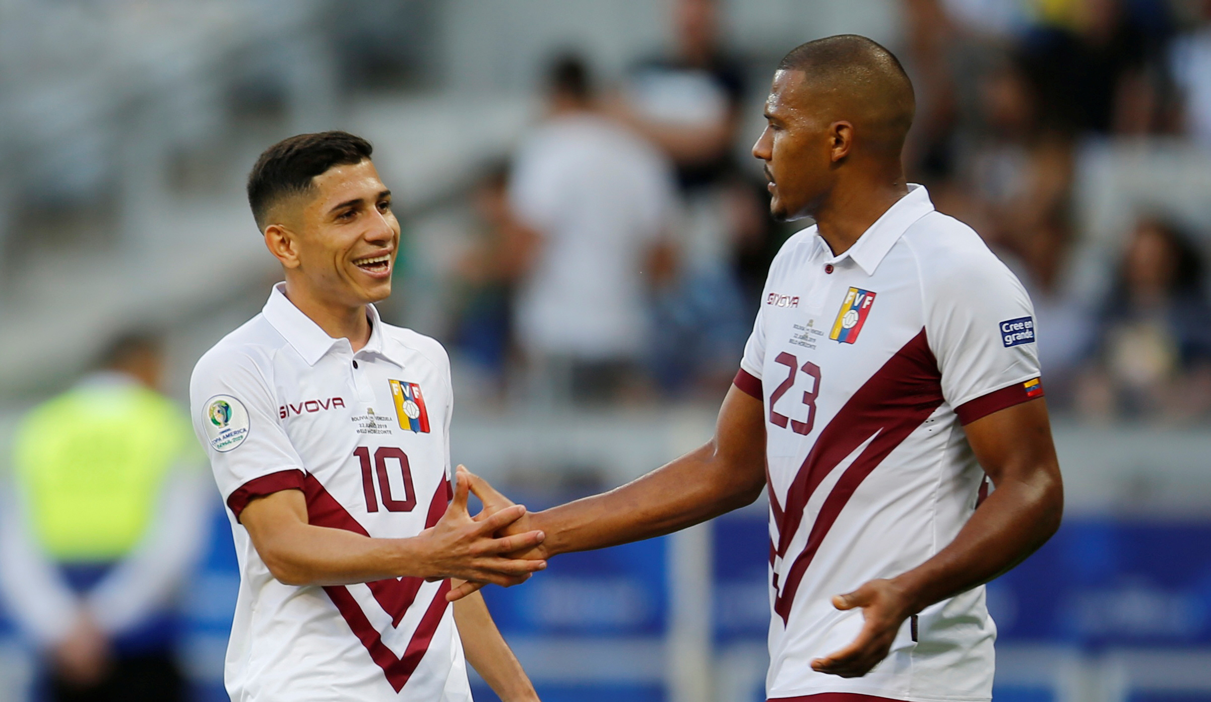 Savarino (el alto) que saluda a Rondon fue muy claro para analizar al crack argentino. "Es muy difícil de marcar, pero intentaremos pararlo", expresó.