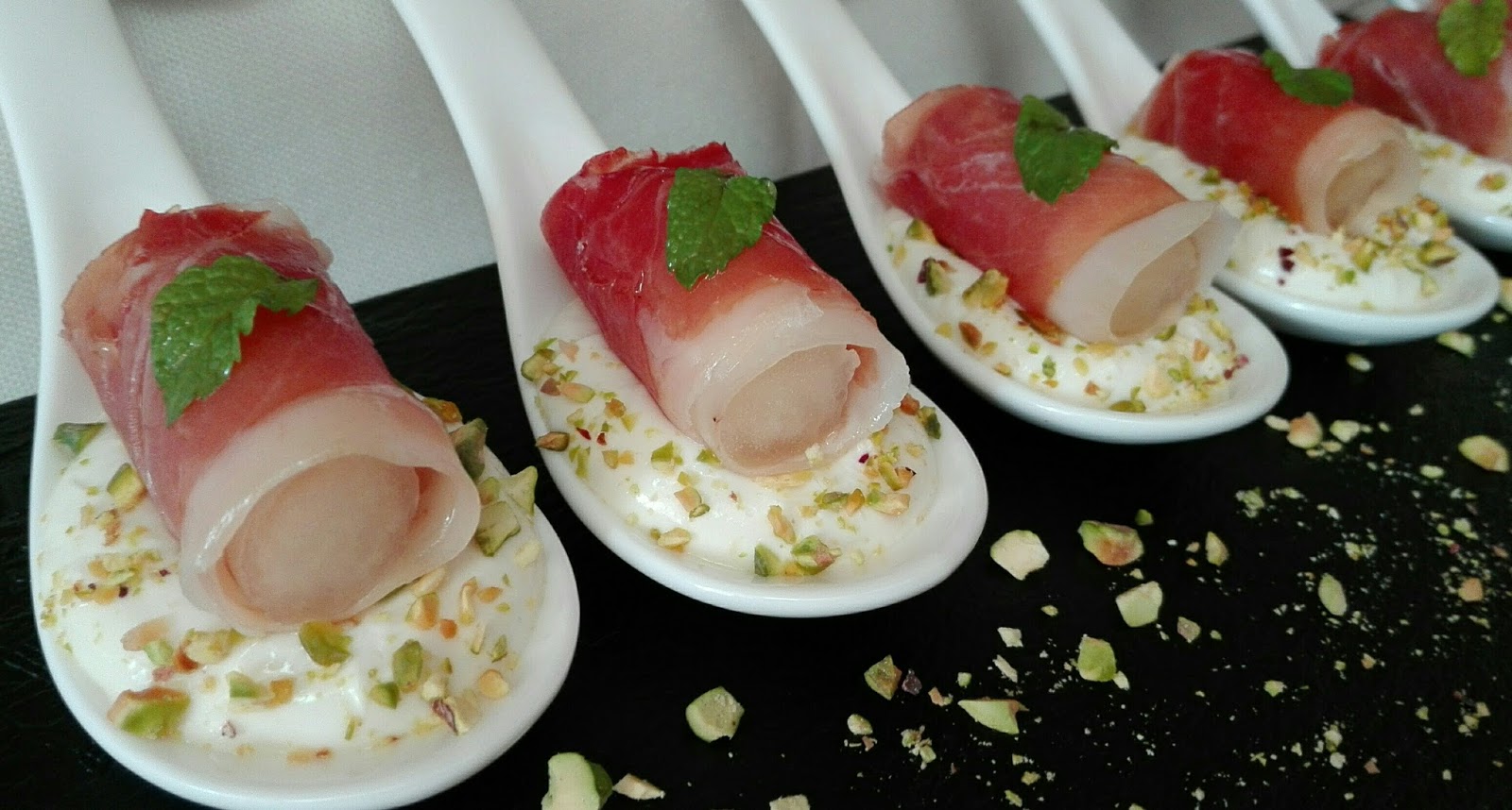 Ingredientes: 4 fetas finas de jamón crudo, 200 gramos de melón, 200 gramos de queso mascarpone, 50 gramos de nueces, 50 gramos de peras deshidratadas, chorrito de vino Mistela, pimienta negra molida cantidad necesaria, sal rosada cantidad necesaria.