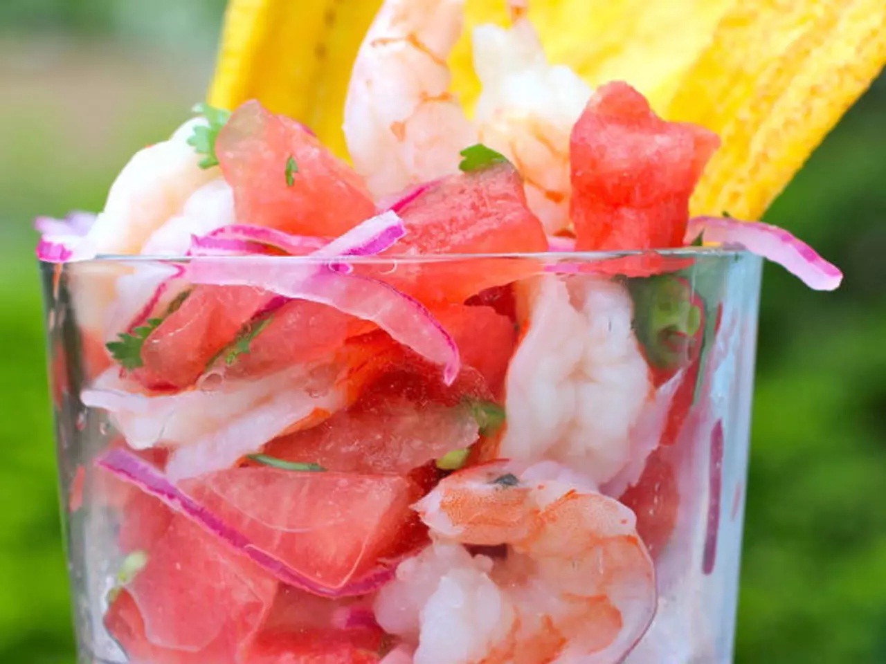 Mientras tanto, pelar y cortar la cebolla morada en rodajas finas, también el pimiento en una fina juliana y picar bien chiquito el ají. Exprimir los limones y cortar la sandía -sin cáscara ni semillas- en trozos medianos, dependiendo del tamaño de los camarones.
