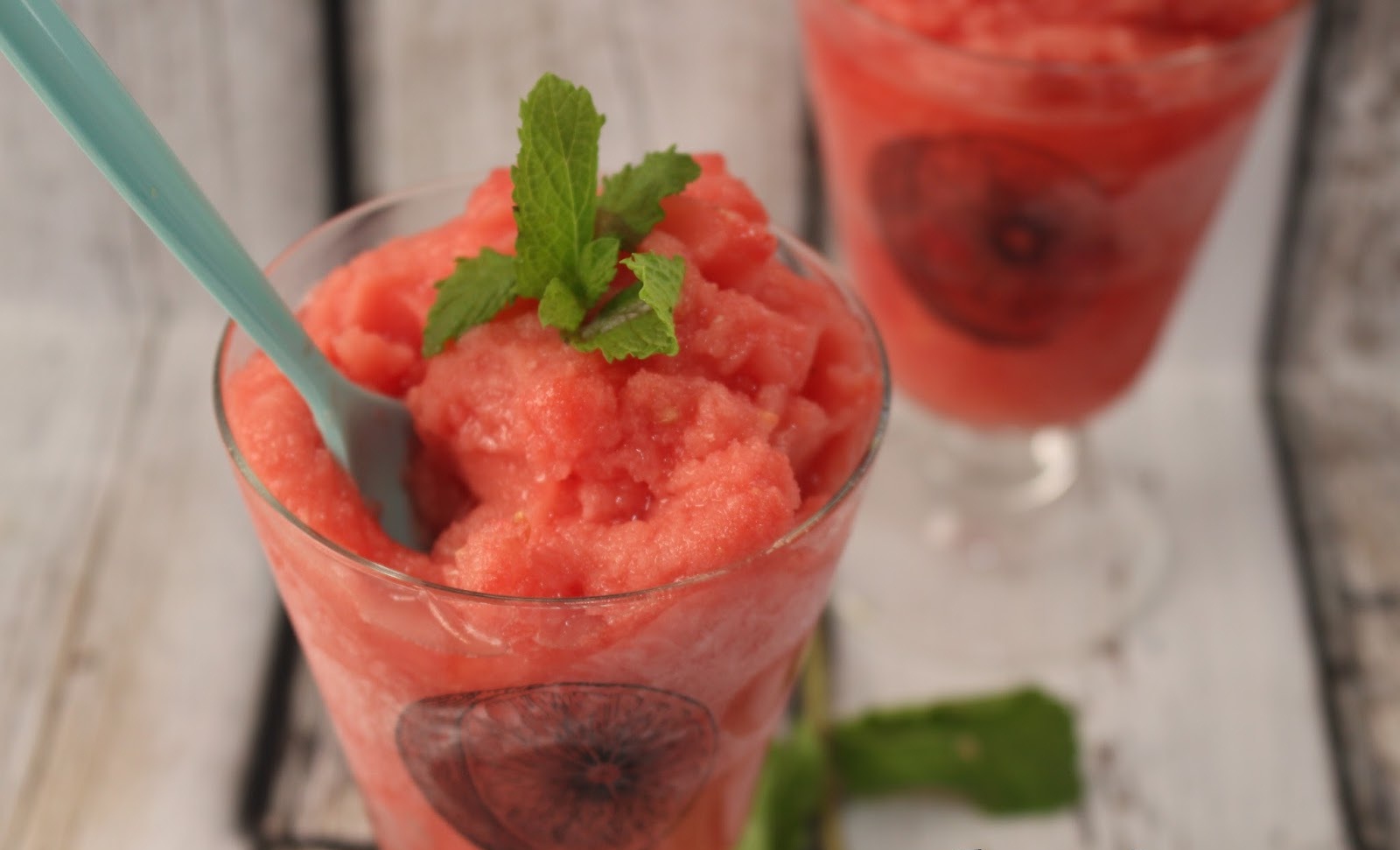 Ingredientes: 500 gramos de sandía, 60 gramos de azúcar, 125 mililitros de agua, 1 puñadito de hierbabuena, 2 cucharadas de jugo de limón, 1 pizca de sal rosada.