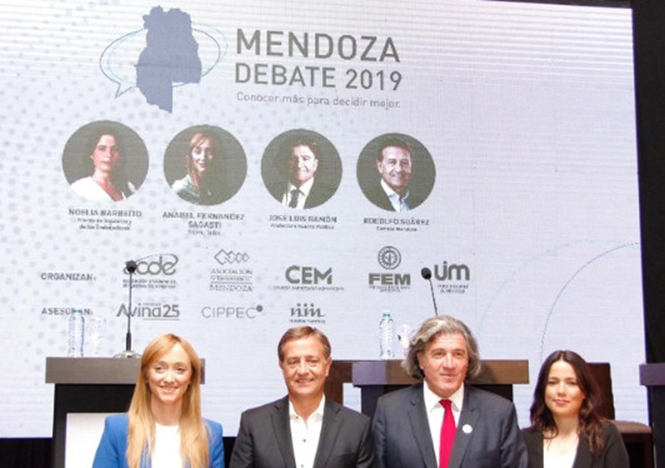 En el salón de un hotel cinco estrellas, los candidatos hablaron de economía, matriz productiva, educación, seguridad. En cuanto a los principales sectores productivos que sus posibles gobiernos priorizarían, Suárez dijo "desarrollar vitivinicultura, minería, petróleo, turismo y energía"; Barbeito priorizó "alimentos, energías alternativas, y software"; Sagasti, lo "energético, turismo internacional e hidrocarburos", y Ramón habló de "agro, turismo, industria y conocimiento".