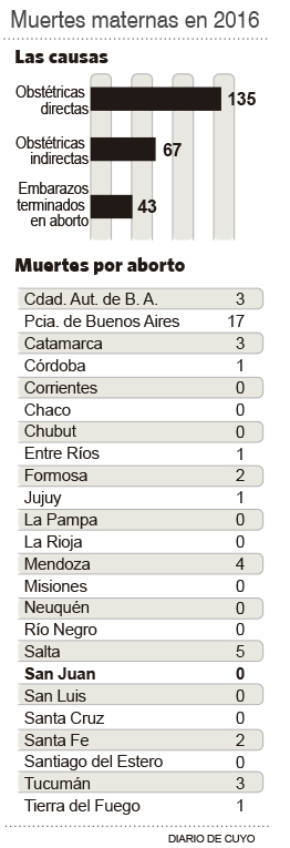 Las muertes maternas registradas durante 2016 fueron las siguientes: Total de muertes maternas (245): Causas obstétricas directas (135), causas obstétricas indirectas (67) y “embarazos terminados en aborto” (43).