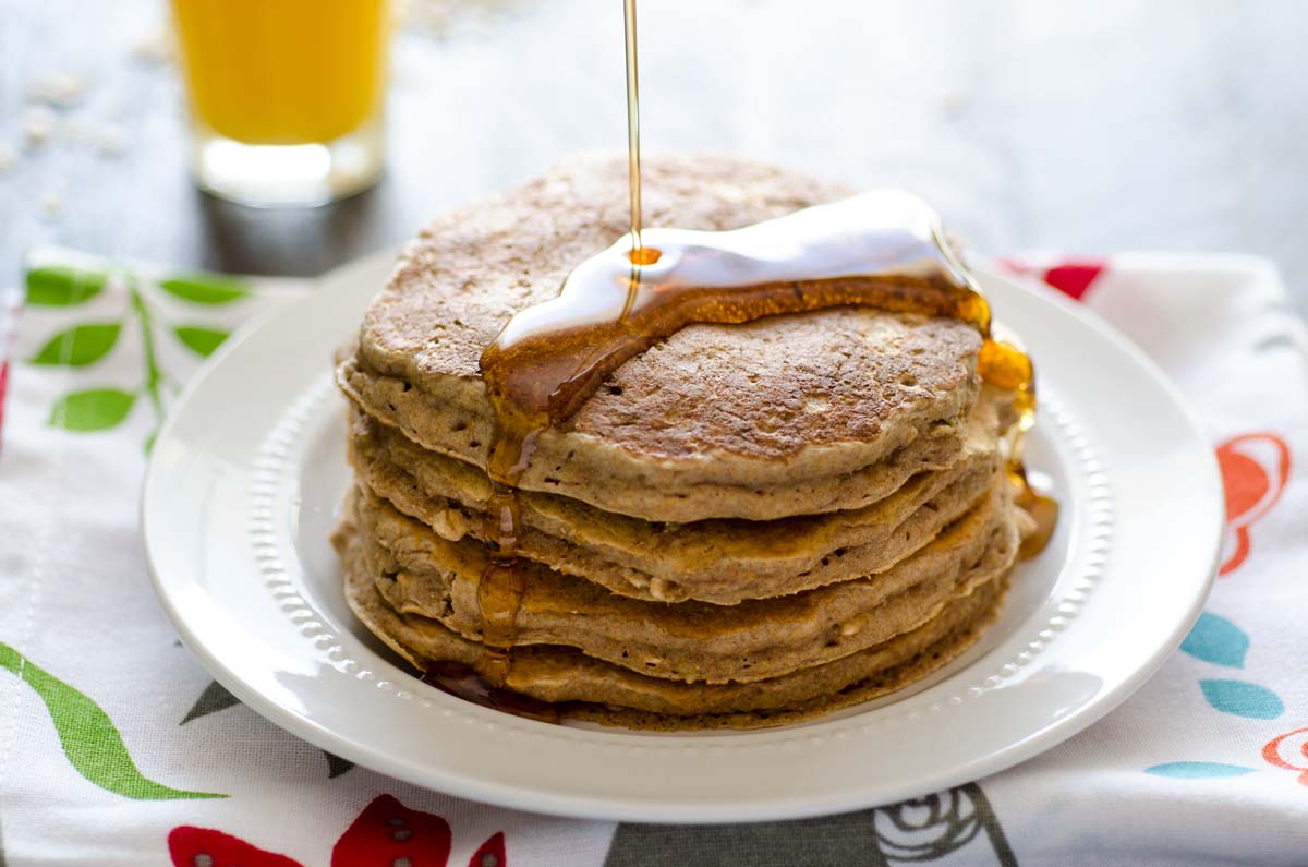 Ingredientes: 2 tazas de avena, 2 cucharadas de polvo de hornear, 1/4 cucharada de sal marina, 1 cucharada de azúcar mascabo, 2 huevos, 1 taza de leche, 2 cucharadas de jugo de limón, 3 cucharadas de aceite de coco, manteca o aceite de girasol.