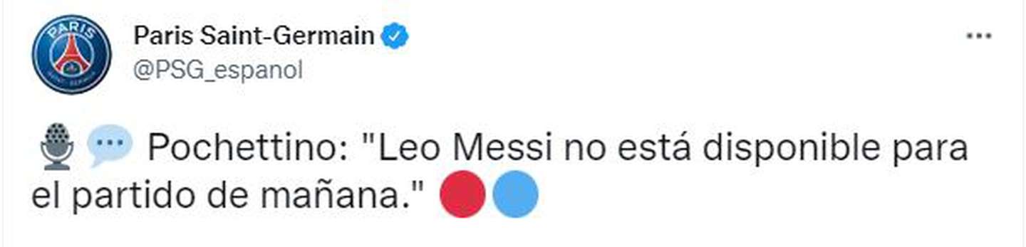 “Lionel Messi no estará disponible para mañana con el equipo”, anunció Mauricio Pochettino, entrenador del equipo de París en conferencia de prensa, y luego confirmó que el club lo habilitará para reunirse con la Selección: “Va a viajar, por supuesto, es un compromiso internacional. Esperemos que pueda jugar en la Selección y que pueda volver en las mejores condiciones”.