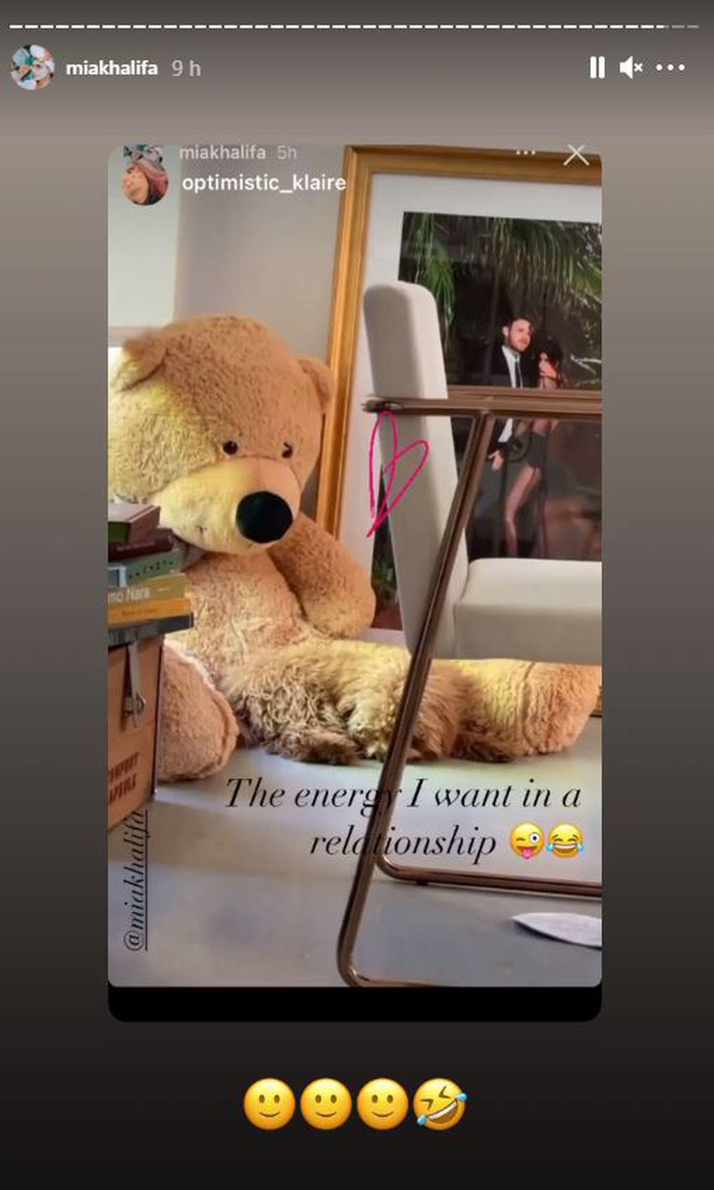 Desde hace tiempo que Mia Khalifa se transformó en una figura de Instagram. Su breve paso por la industria pornográfica y su lucha para que borren ese contenido de Internet la volvió aún más popular y a diario comparte todo tipo de fotos con sus millones de seguidores. Pero la influencer tuvo un desliz al subir una historia que, como siempre, sacó a relucir su gran humor: al mostrar a su mascota, apareció un cuadro con una foto íntima con su marido en la que está recreando una pose sexual.
