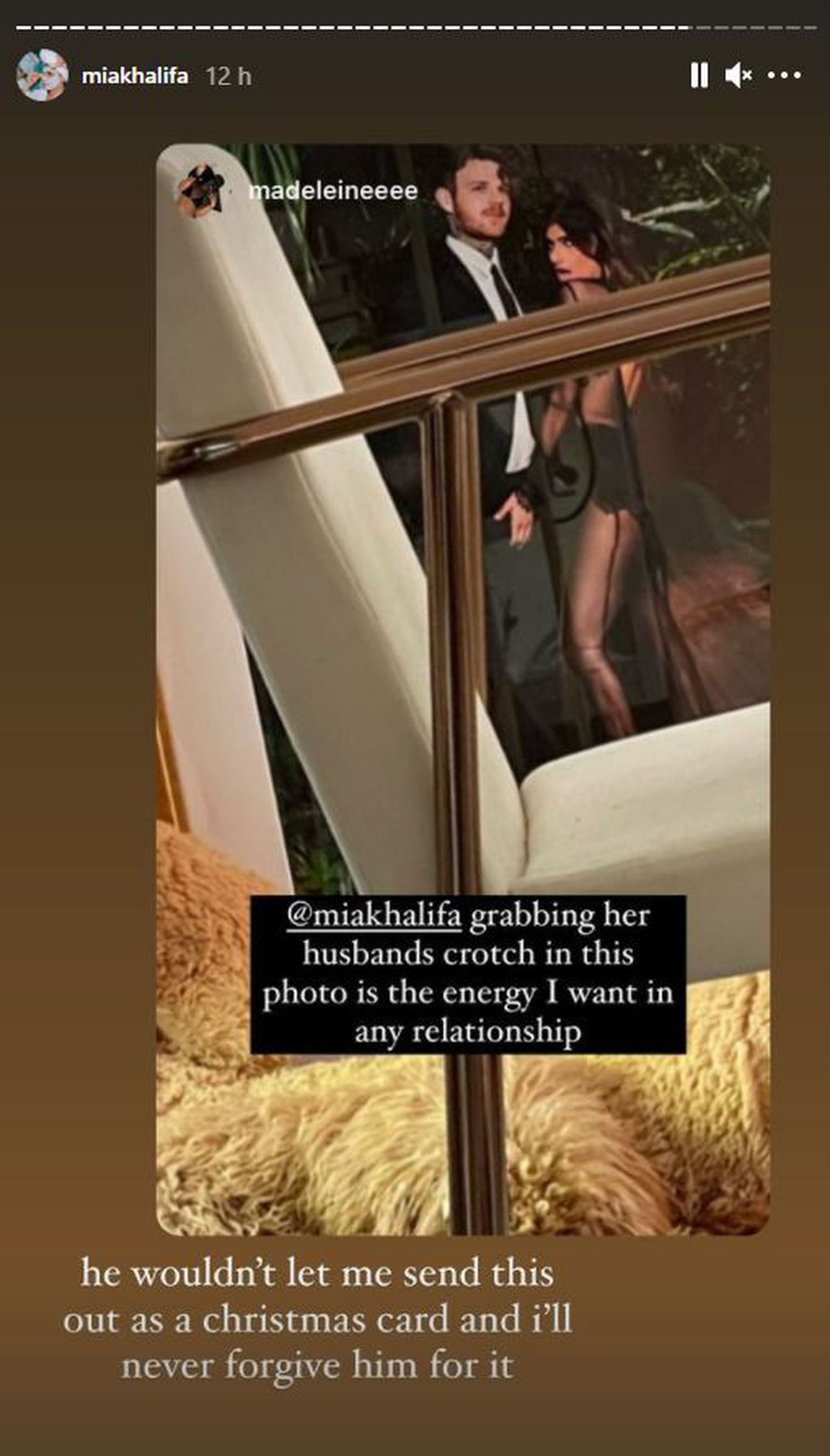 Minutos después, la exestrella porno compartió varios posteos de fanáticos que remarcaron ese detalle. “Mia Khalifa agarrándole la entrepierna al marido es la energía que quiero para cualquier relación”, le comentó una usuaria. “No me dejó mandar esta foto como una postal de Navidad y nunca lo voy a perdonar por eso”, le comentó ella con mucha complicidad.