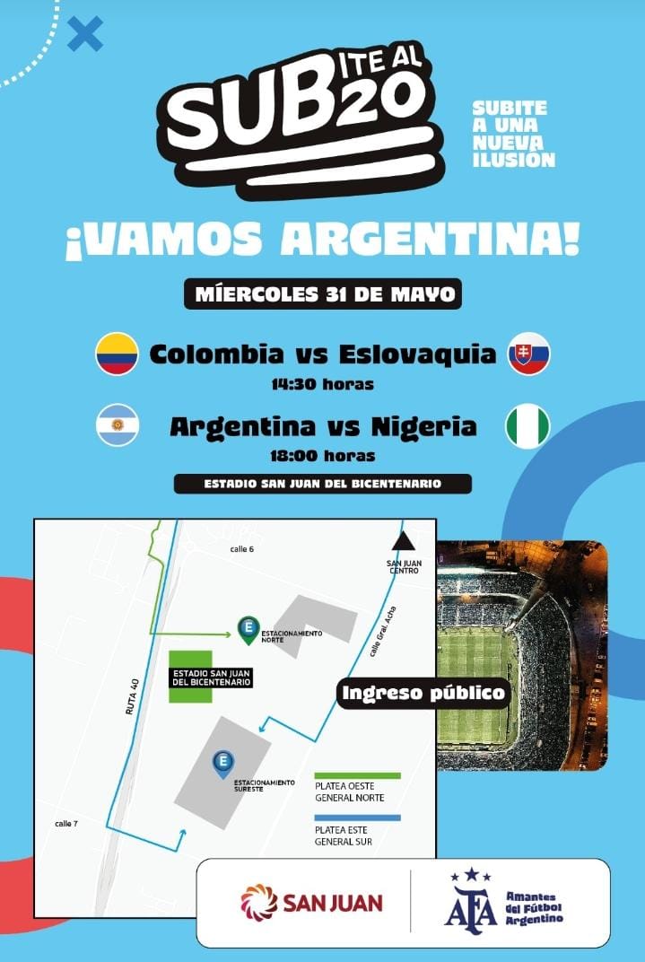 San Juan vivirá este miércoles otra cita histórica. Por primera vez, el Estadio del Bicentanrio será sede de un encuentro válido por Octavos de final donde la Selección argentina Sub 20 buscará la clasificación a Cuartos de final del Mundial Sub 20. Su rival será Nigeria desde las 18 horasl. Es tanta la expectativa que los tickets están agotados y en las calles del microcentro se puede vivir el clima mundialista, con cientos de turistas recorriendo confiterías y bares de la ciudad.