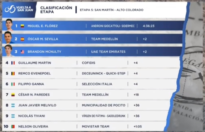 El gran ganador de la etapa Reina, el quinto parcial de la carrera, fue el colombiano Miguel Flórez (Andreoni Giocattoli), quien metió un ataque letal a metros de la línea de llegada y dejó en el camino las aspiraciones de los integrantes del grupo de punta. El que sí conservó su objetivo fue el belga Remco Evenepoel, ya que realizó un trabajo espectacular en la montaña y finalizó quinto en la etapa para seguir en lo más alto de la tabla acumulada.