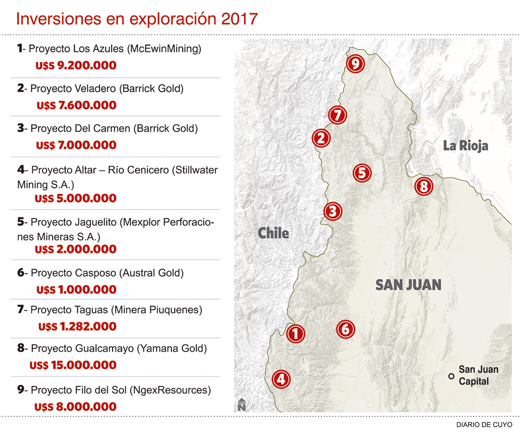 Al parecer, en el 2017 las mineras prevén gastar una buena cantidad de dólares para intensificar las exploraciones mineras en la cordillera sanjuanina en busca de metales preciosos de oro y plata, además de cobre. De acuerdo a los planes de prospección y exploración minera que han sido entregados hace unas semanas al Ministerio de Minería (quien concesiona los proyectos), un total de 9 compañías proyectan invertir este año U$S 56 millones, que al cambio de ayer significan $ 882 millones.
