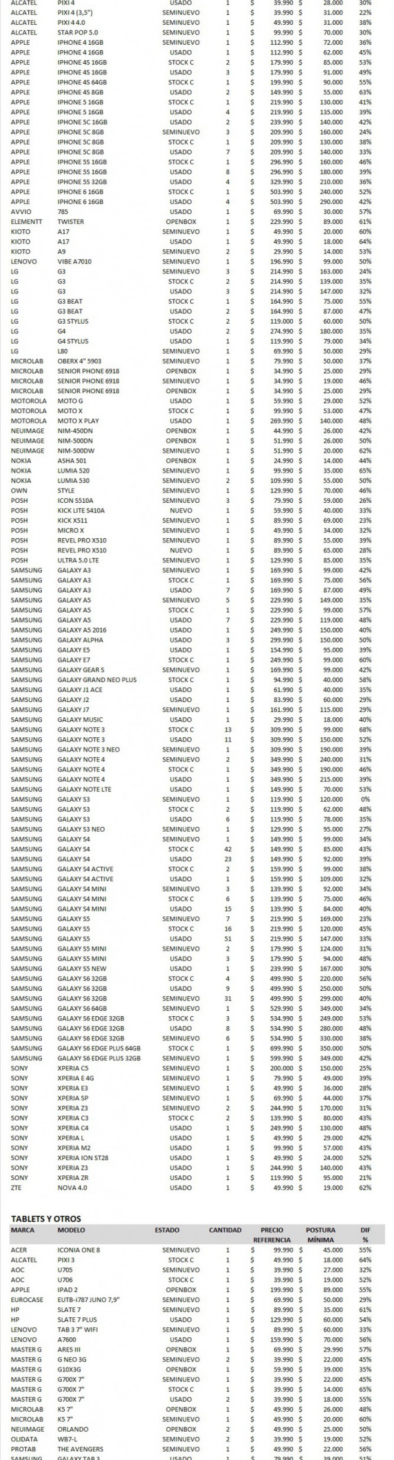 Según informó el diario chileno Las Últimas Noticias, el remate considera equipos de 22 marcas y van desde Iphone hasta tablet Samsung con todo medio de pago. En este tipo de remates, indican los conocedores, la postura mínima generalmente corresponde al 60% del valor de precio del mercado. Los equipos tienen una garantía técnica de 30 días.