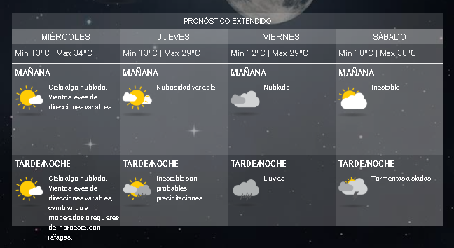 El jueves estará inestable con probables precipitaciones en la noche y la máxima será de 29ºC. Para el viernes y sábado, la máxima oscilará entre los 29 y 30 grados mientras que habrá lluvias y tormentas aisladas.