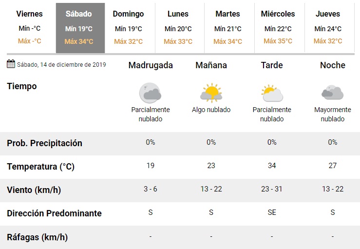 Luego de una semana con temperaturas altas, para el fin de semana el anhelo era que la máxima descendiera pero se prevé más calor. Según el Servicio Meteorológico Nacional, para el sábado se espera una máxima de 34°C y una mínima de 19°C.
