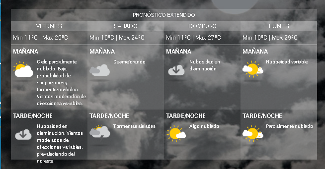 Para este viernes, el Servicio Meteorológico Nacional ha pronosticado una máxima de 25ºC y una mínima de 11ºC.