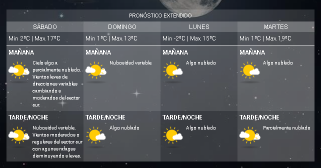 Para este sábado, el Servicio Meteorológico Nacional informa que la máxima llegará hasta los 17ºC con una mínima de 2ºC. Por su parte, Dirección de Protección Civil emitió una alerta ante el inminente ingreso de frente frío.