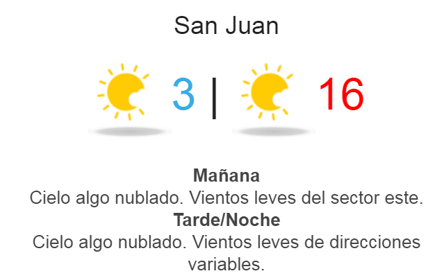 El Servicio Meteorológico Nacional dio a conocer el pronóstico para este martes en San Juan, donde seguirá el frío pero con la ventaja que el Sol estará para calentar la jornada.