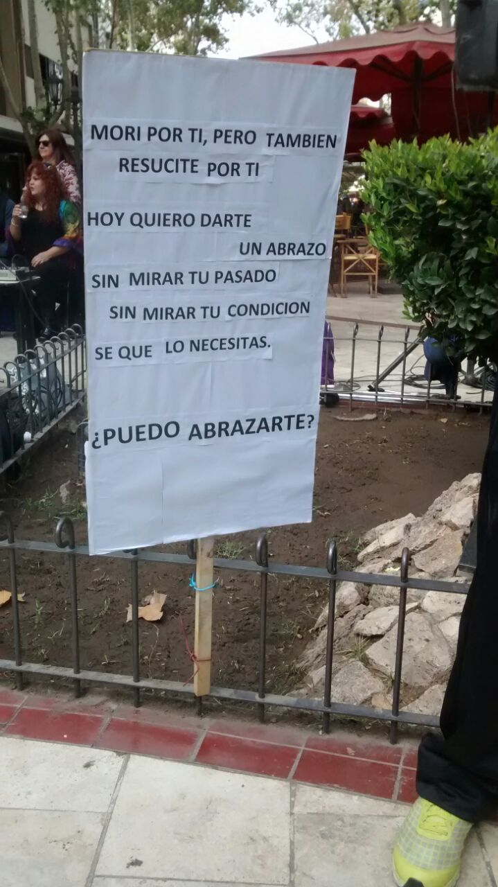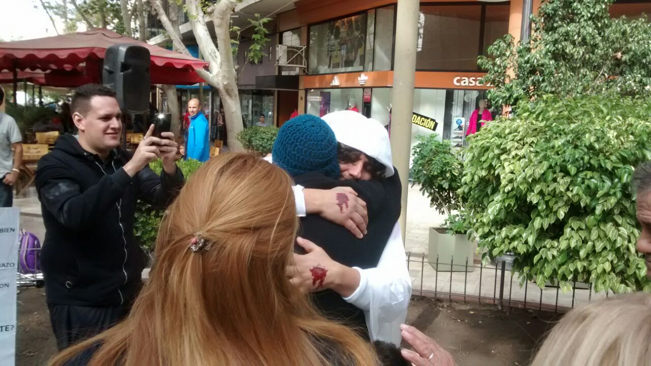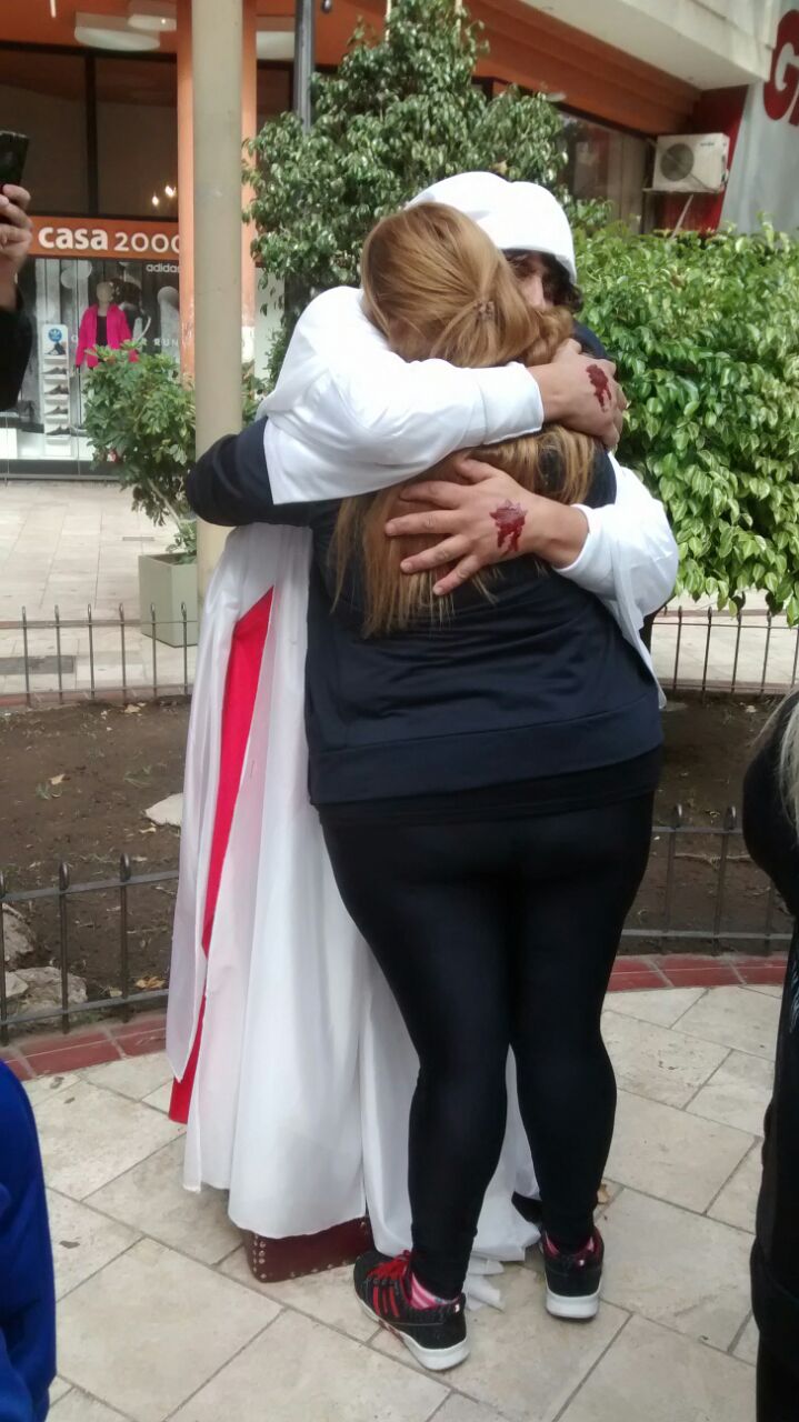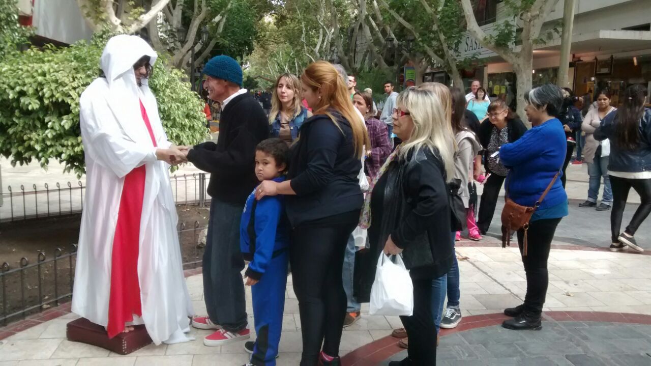 Quienes este sábado por la mañana se acercaron al microcentro sanjuanino se toparon con una postal rara. Un hombre vestido de Jesús que ofrecía abrazos a todo aquel que quisiera.