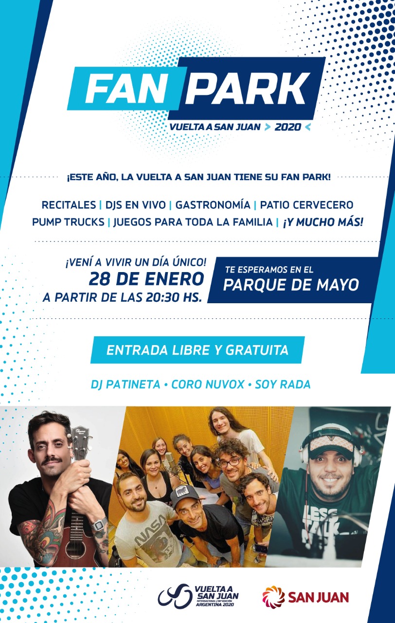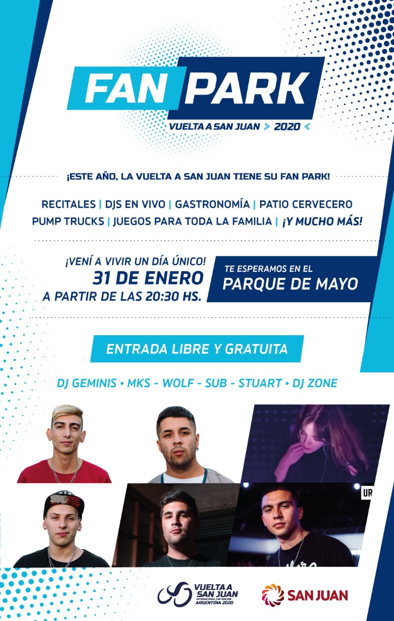 A partir de este domingo, el Parque de Mayo será el escenario de la diversión y las tardes de encuentro de la Vuelta a San Juan. Aquí la grilla de artistas que estará en la "Fan Park", que contará con gastronomía, patio cervecero, pump truck y juegos para toda la familia.