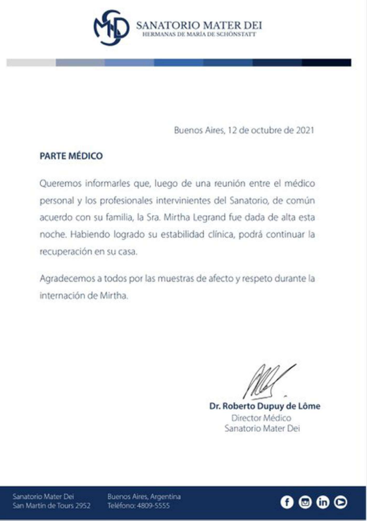 “Queremos informarles que, luego de una reunión entre el médico personal y los profesionales intervinientes del Sanatorio, de común acuerdo con su familia, la Sra. Mirtha Legrand fue dada de alta esta noche”, se lee en el informe firmado por el director médico de la clínica, Roberto Dupuy de Lôme.