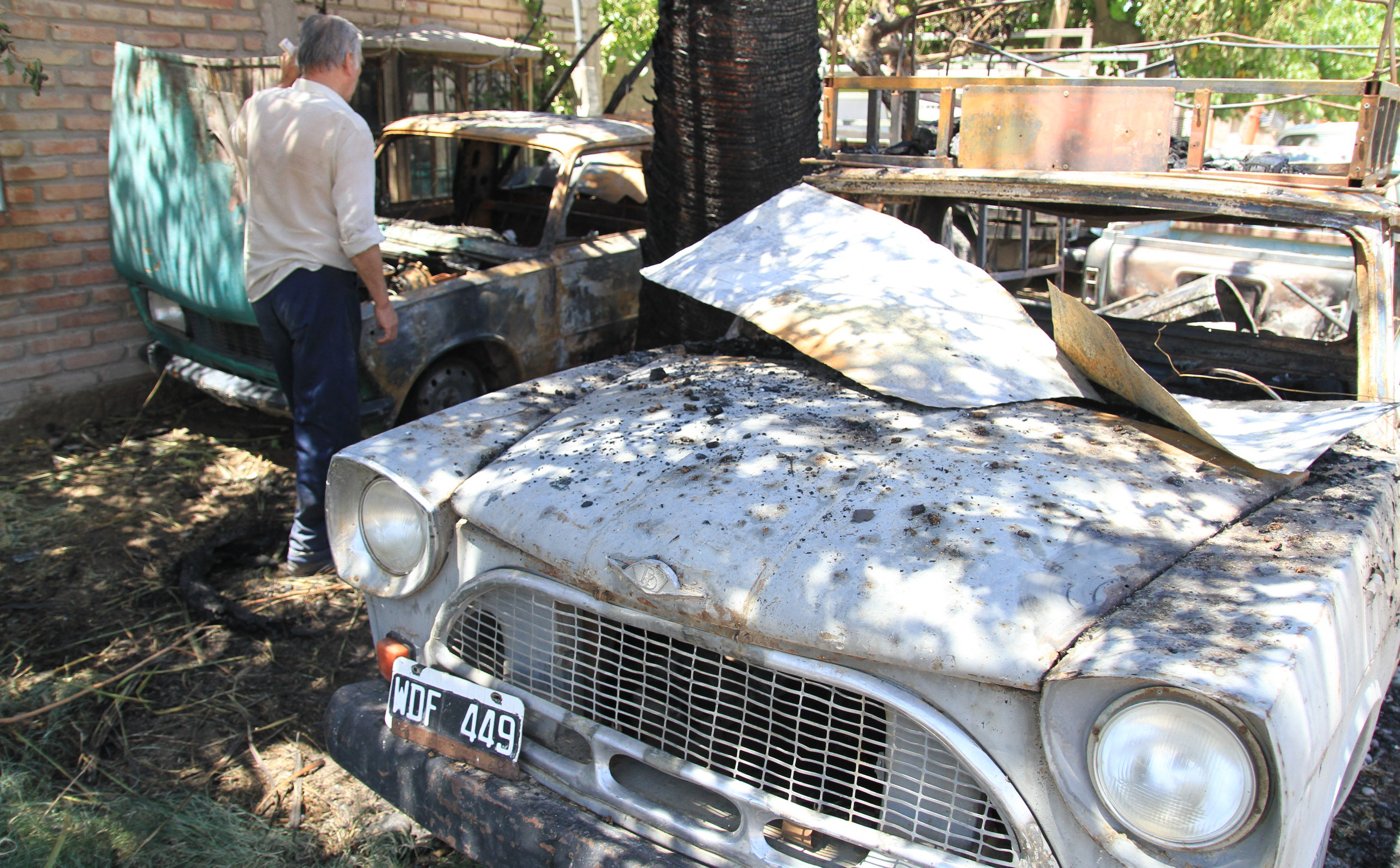 Juan Hernández tiene 68 años, pero como no está jubilado se la tiene que rebuscar para poder mantener a su familia. "Compro y vendo cosas usadas, hago fletes, junto chatarra… me la rebusco todos los días", explicó. Entonces que ayer le hayan quemado dos de los vehículos que utilizaba para hacer esas actividades para él significó un gran perjuicio. "Tengo mucha bronca, he perdido mucho dinero, más de $100.000. Uno está todos los días trabajando, ¿para qué? Para nada…", dijo ayer mientras miraba con lamento lo que quedó de un Rastrojero y una Fiat 125. Todo ocurrió minutos antes de las 5 de ayer. Los vehículos de Hernández estaban estacionados uno al lado de otro en la puerta de su casa, ubicada en el interior de la Villa Centenario, en Chimbas, sobre la calle Gobernador Izasa. A unos 100 metros de allí, a otro vecino también quisieron prenderle fuego su auto, un Dodge 1500, pero le avisaron a tiempo y pudo evitar daños mayores.