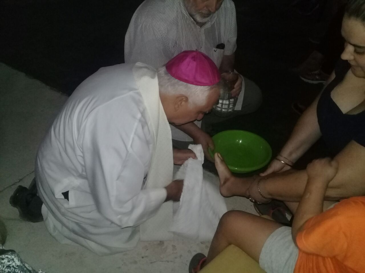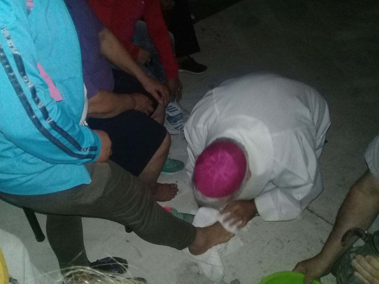 Anoche, en el marco de las actividades religiosas por el Jueves Santo, monseñor Jorge Lozano se acercó a Vallecito para ofrecer misa y lavó los pies de 12 peregrinos que caminaron hacia el paraje de la Difunta Correa.