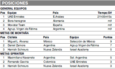 Miguel Álvarez, ciclista de la Selección de México, tuvo uno de esos días soñados. Apenas comenzada la etapa de ayer se probó y partió. Logró cortarse junto a otros tres ciclistas: Schreus de Israel junto a Gohr y Bravo, de los seleccionados de Brasil y Chile, respectivamente. Tanta fe se tuvo el mexicano que se adueñó de tres de las cuatro metas de montaña del día y con los 9 puntos pasó a liderar esa clasificación. "Estoy muy contento, por mi rendimiento personal y por lo que estamos viviendo. Este tipo de eventos para nosotros nos viene muy bien porque tenemos roce y nos permite mostrarnos ya que la idea es obtener buenos resultados e insertarse en el ciclismo europeo", contó. Sobre la carrera de ayer y su futuro explicó: "Fue dura la etapa pero me sentía muy bien y fui a buscar las metas. Ese objetivo buscaré hasta el final".