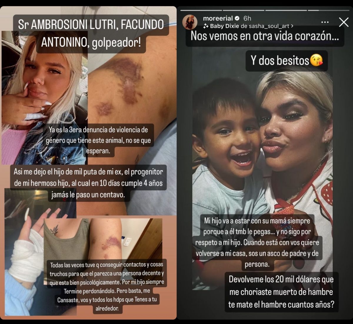 En otro posteo, junto a una foto de su hijo Francesco, señaló: “Cuando está con vos quiere volverse a mi casa, sos un asco de padre y de persona”, y le exigió que le devolviera el dinero que le robó: “Devolveme los 20 mil dólares que me choriaste (SIC) muerto de hambre, ¿Te maté el hambre cuantos años?”.