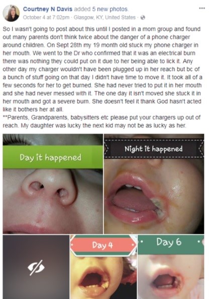 Courtney Davis, una madre de Glasgow, Kentucky (Estados Unidos) tuvo un accidente con su bebé de 19 meses. La pequeña se quemó la boca luego de lamer un cargador de celular.
