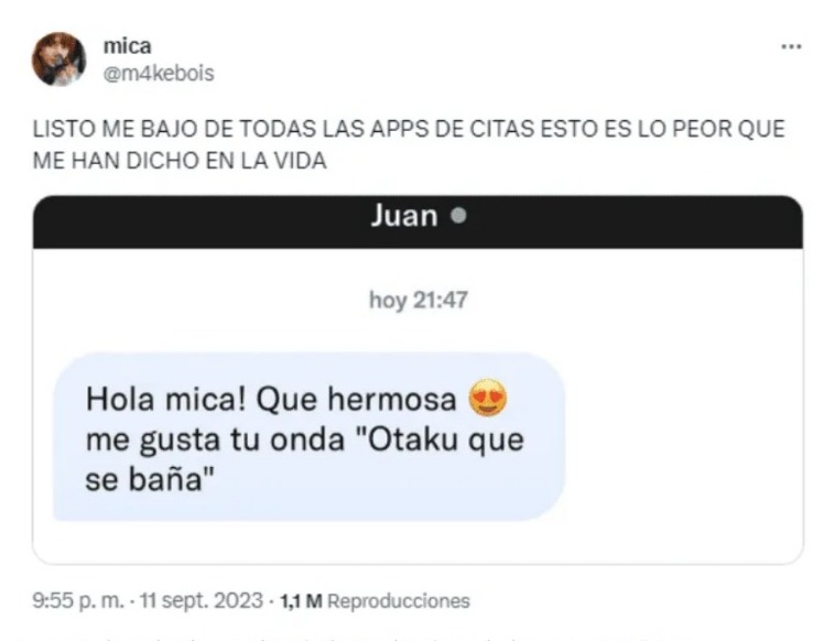 “Hola Mica! Qué hermosa. Me gusta tu onda de Otaku que se baña”, fue el mensaje que recibió la joven y reveló con una captura del chat privado. Y en su posteo, la usuaria "Mica" escribió en mayúscula su enojo: “Listo me bajo de todas las app de citas. Esto es lo peor que me han dicho en la vida”.