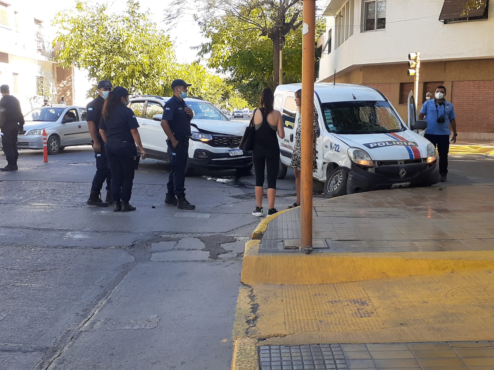 Un utilitario Renault Kangoo de la División Criminalística de la Policía de San Juan casi terminó en la vereda Noroeste de Santa Fe y Entre Ríos tras imapctar contra un Volkswagen T-Cross.