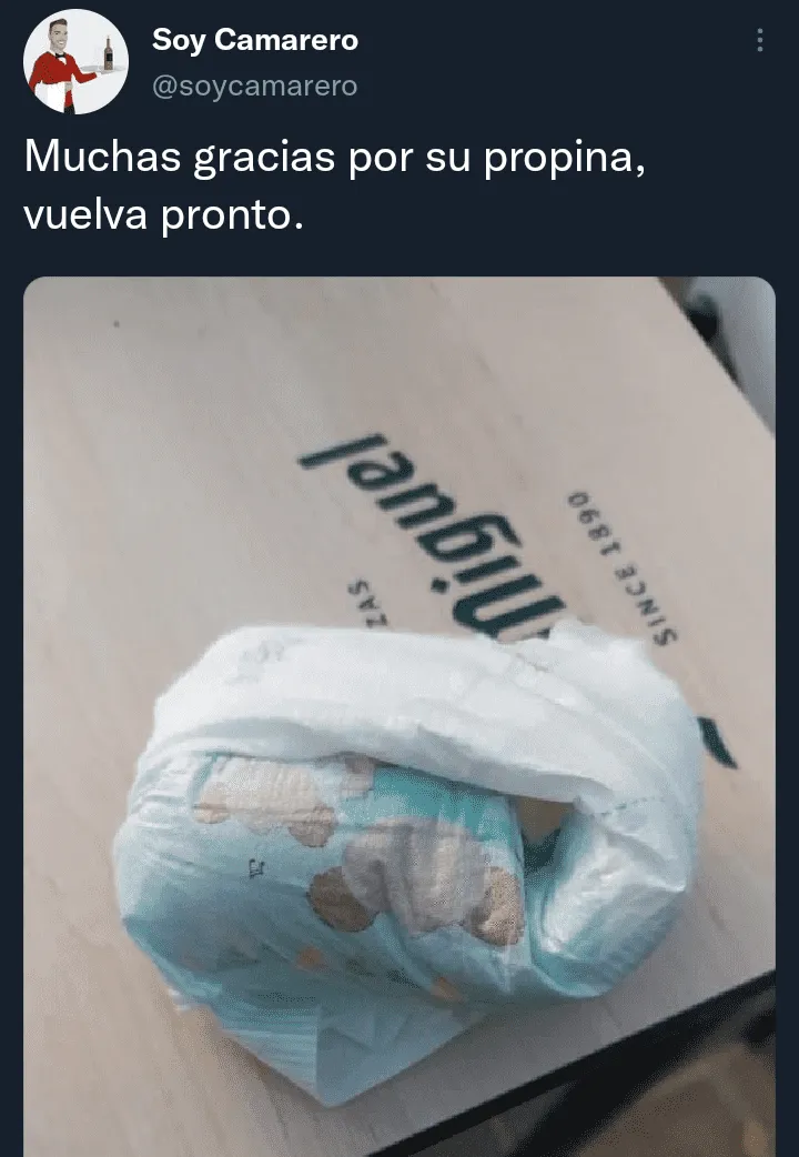 “Muchas gracias por su propina, vuelva pronto”, dice el tuit acompañado por una imagen de una mesa de un bar con un pañal usado dejado por unos clientes para que lo recojan los empleados.